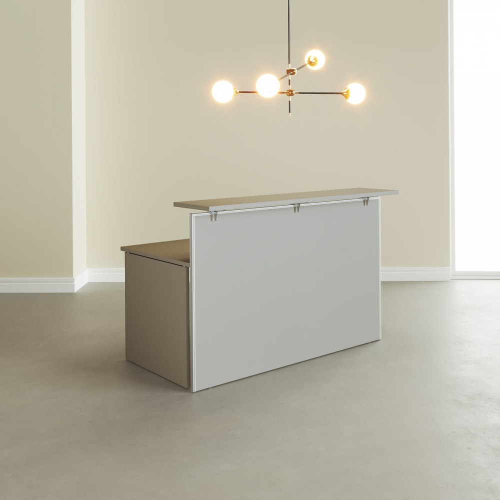- A união entre o tampo do balcão e a estrutura do balcão é realizada por meio de um grampo metálico e com acabamento com pintura epóxi PRATA RAL-9006