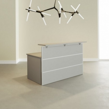 - A união entre o tampo do balcão e a estrutura do balcão é realizada por meio de um grampo metálico e com acabamento com pintura epóxi PRATA RAL-9006