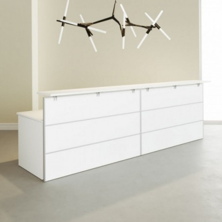 - Tampo de balcão em melamina de 25 mm de espessura e rebordos exteriores em ABS de 2 mm de espessura aplicados com cola termofusível e arestas arredondadas.