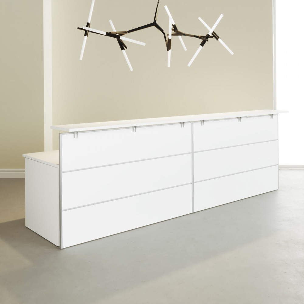 - A união entre o tampo do balcão e a estrutura do balcão é realizada por meio de um grampo metálico e com acabamento com pintura epóxi PRATA RAL-9006