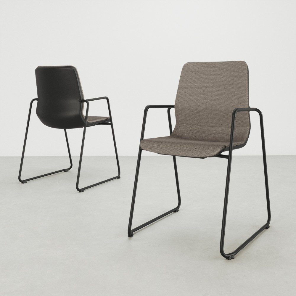 - Armação com forma de patim em tubo redondo de aço laminado a frio de Ø15 mm, com 1,5 mm de espessura, reforçada com uma placa de aço estampado de 2,5 mm de espessura.