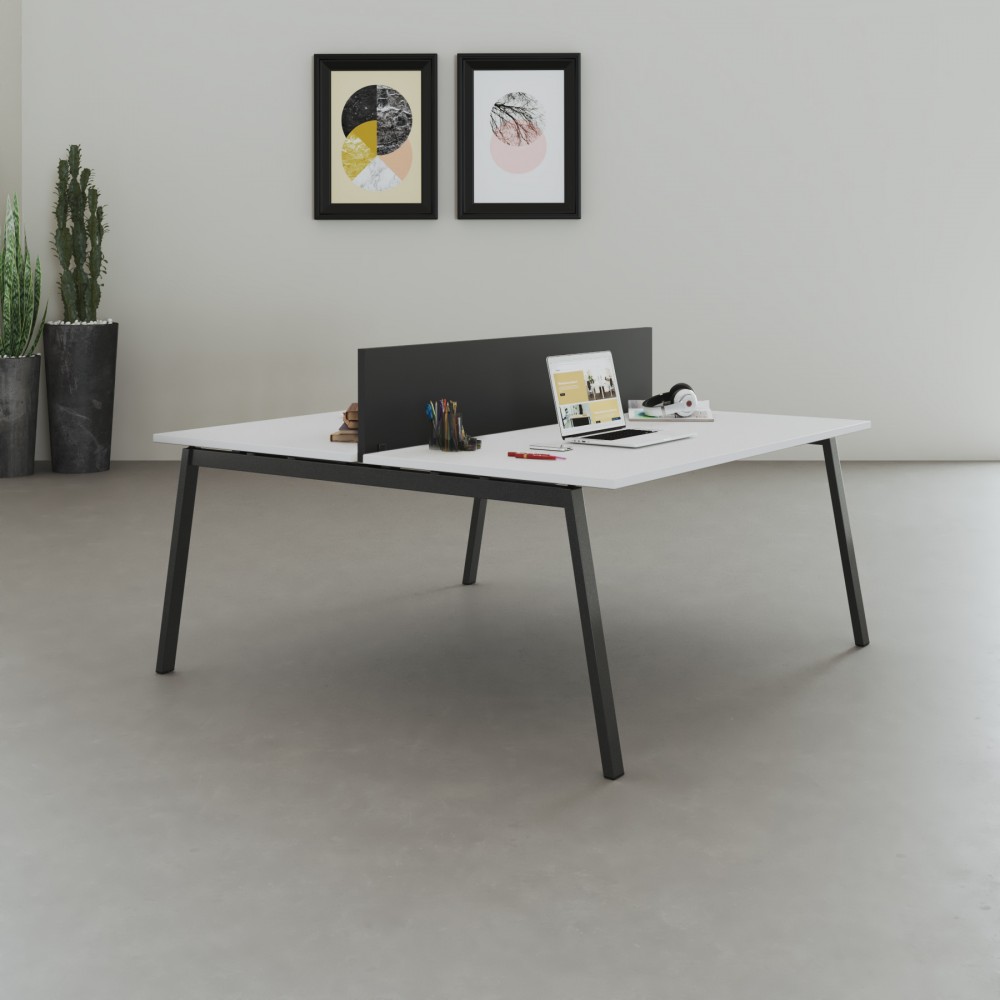 - Plafón separador frontal de 28cm de altura fabricado en melamina grafito de 25mm de espesor y anclado a la mesa mediante pinzas.