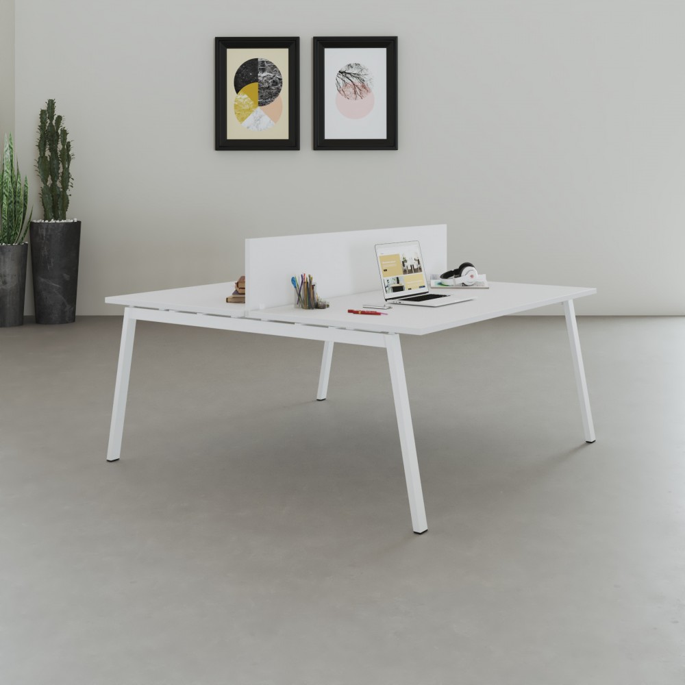- Plafón separador frontal de 28cm de altura fabricado en melamina blanca de 25mm de espesor y anclado a la mesa mediante pinzas.