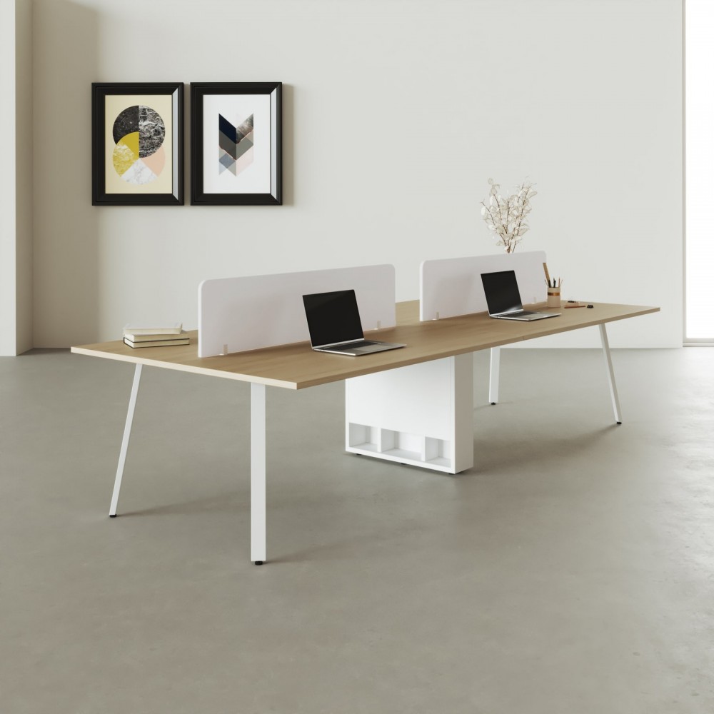 - Painel separador frontal de 38 cm de altura fabricado em melamina ou estofado de 25 mm de espessura e fixado à mesa por meio de grampos