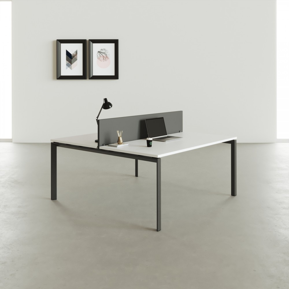 - Painel separador frontal com 28 cm de altura fabricado em melamina grafite de 25 mm de espessura e fixado à mesa por meio de grampos