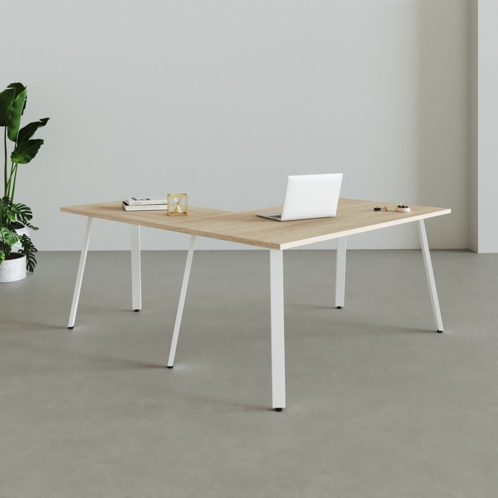 - Saia em melamina com um espessura de 19 mm e rebordo arredondado de 2 mm com acabamento em branco e fixado à mesa por meio de esquadra de fixação metálicas.