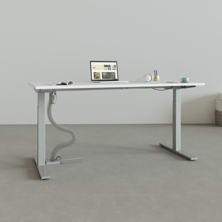 Mesa ajustável em altura que permite trabalhar sentado ou em pé conforme as necessidades individuais, fomentando o bem-estar dos utilizadores.