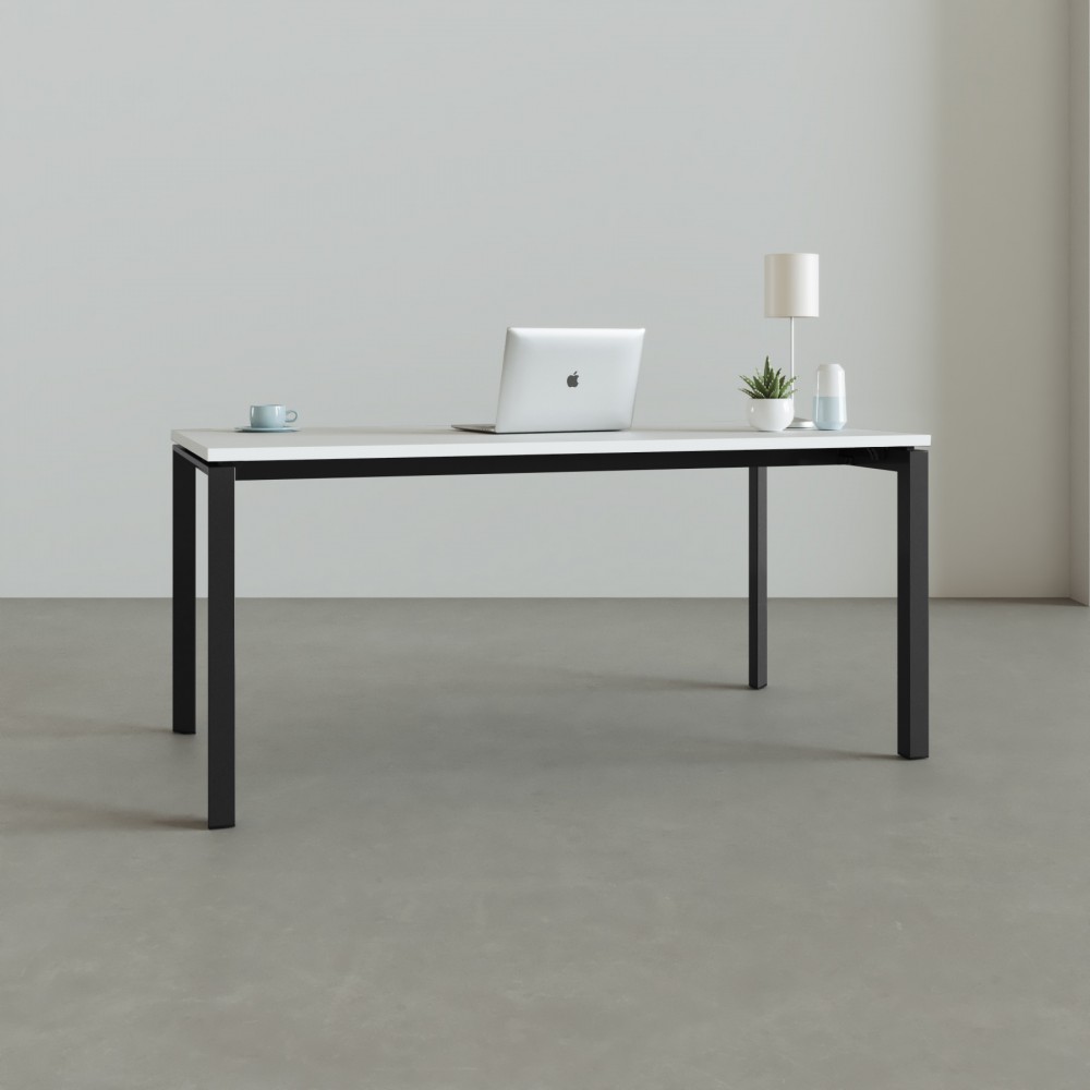 - Painel separador de 1 nível, tanto frontal como lateral, com 28 cm de altura e fabricado em melamina de 25 mm de espessura e fixado à mesa por meio de grampos pintados com pintura epóxi.