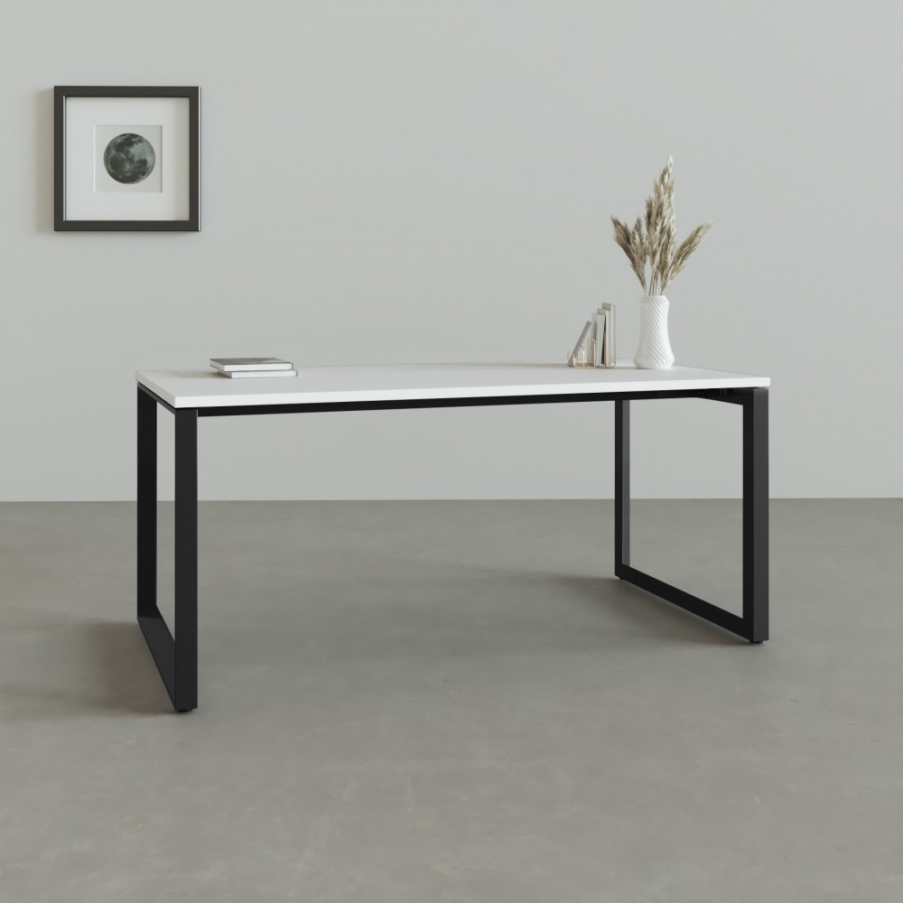 - Saia em melamina com um espessura de 19 mm e rebordo arredondado de 2 mm com acabamento em branco e fixado à mesa por meio de esquadra em aço pintadas com pintura epóxi.