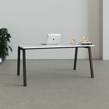 - Saia em melamina com um espessura de 19 mm e rebordo arredondado de 2 mm com acabamento em branco e fixado à mesa por meio de esquadra em aço pintadas com pintura epóxi branca
